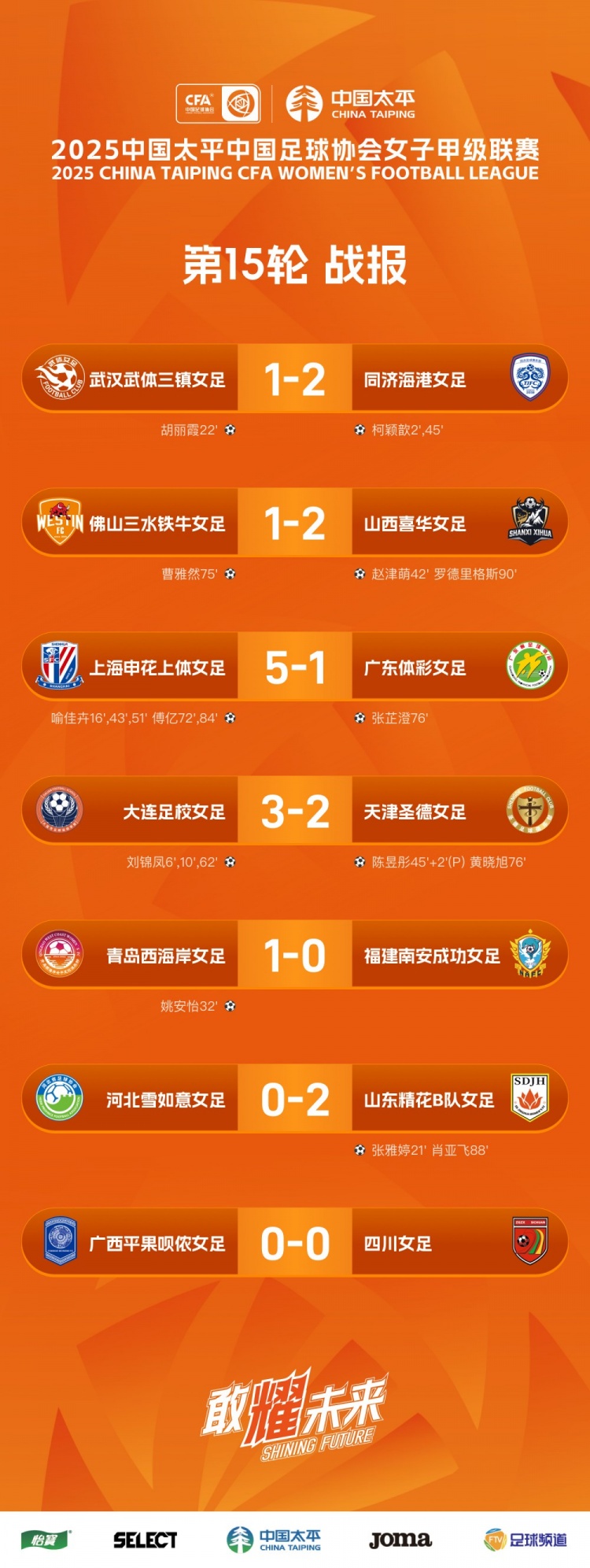 2025女甲联赛第15轮战报、积分榜、射手榜